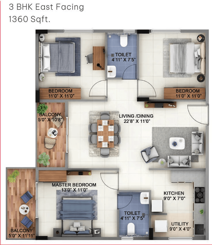 Anti-skid mat finish tiles for Utility, Balcony & Toilets.
