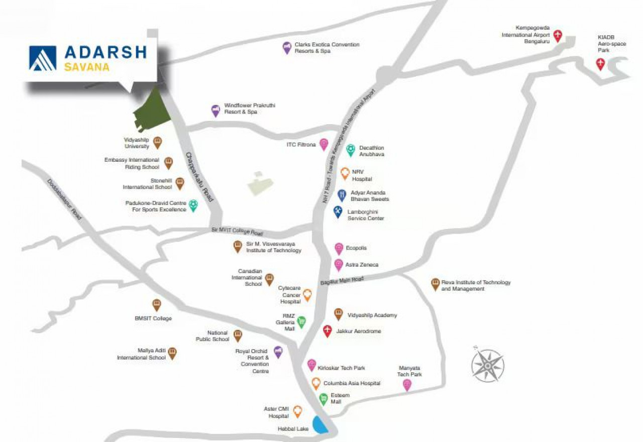 Adarsh Savana Location has excellent connectivity & it is located at the crux of Yelahanka, Jakkur, Doddaballapura Road, and the Bangalore International Airport Road near existing and upcoming communities & facilities.