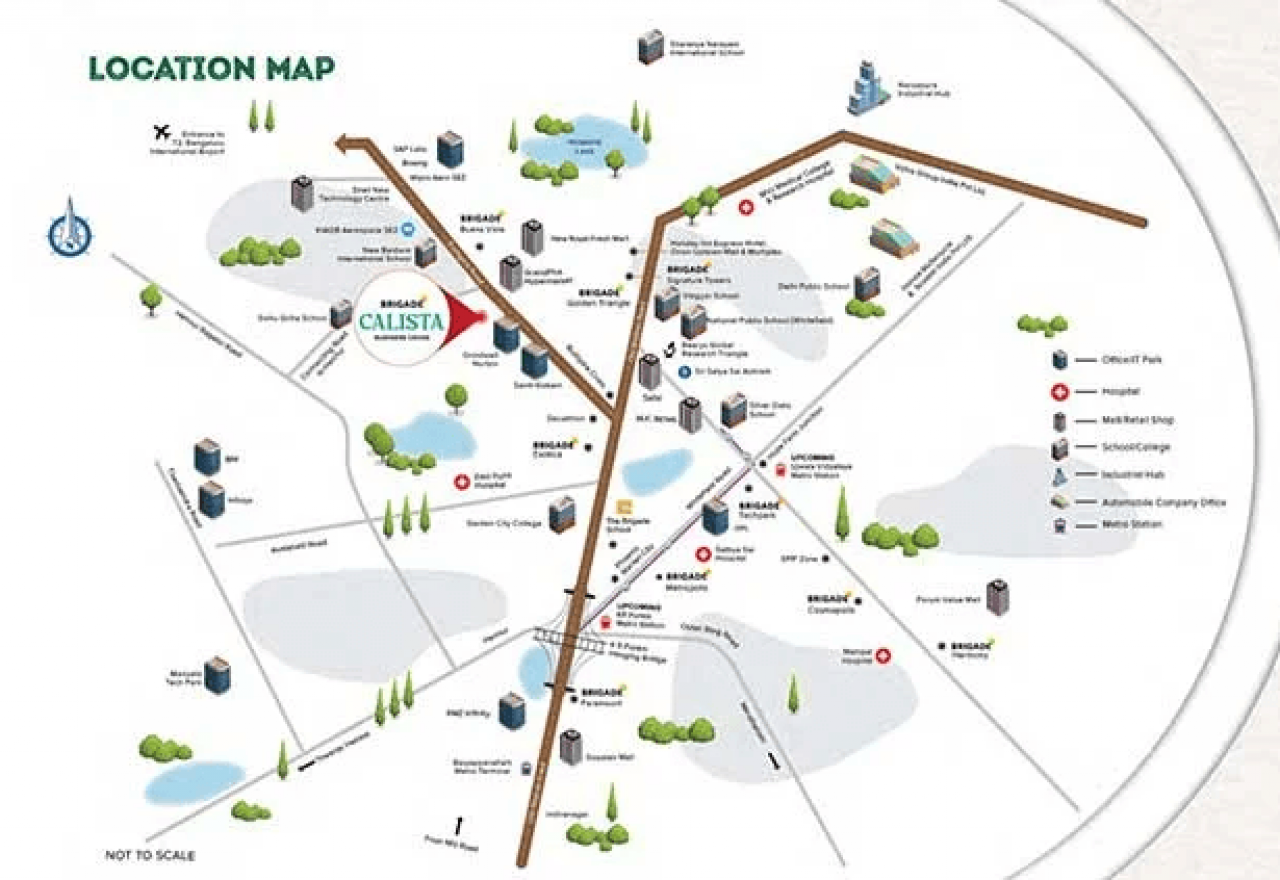 Brigade Calista Location has excellent connectivity & it is located at the crux of Budigere Cross on Budigere Rd just off Old Madras Road, Whitefield near existing landmarks like Prestige Tranquility, Brigade Buena Vista, Shriram Greenfield, and upcoming communities & facilities.