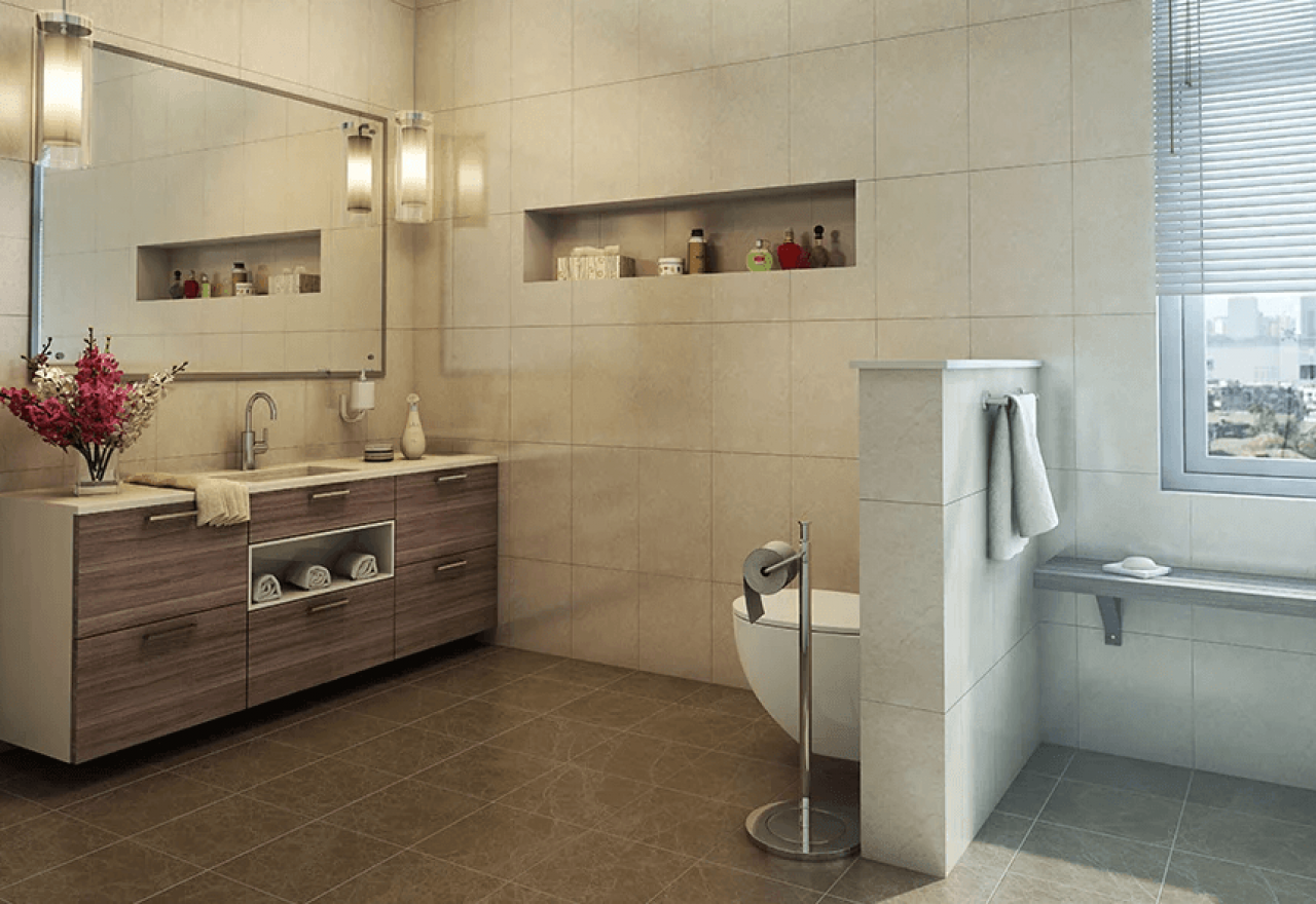 Anti-skid Ceramic Tiles (1’X1′) in Toilets.