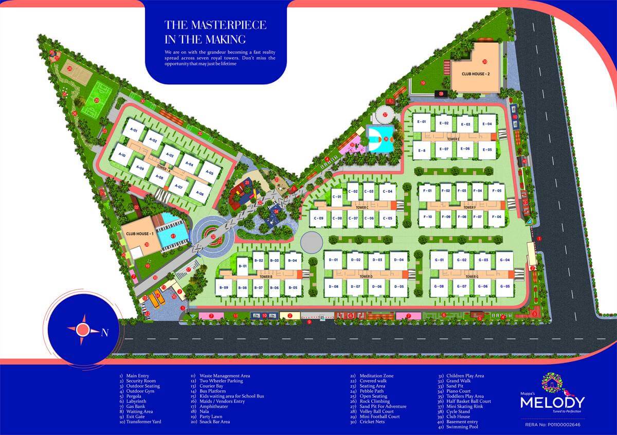 Amenities at Muppas Melody Tellapur include 2 Independent clubhouses spanning 42,000 sqft, landscaped gardens, gymnasium, swimming pool, recreation rooms, outdoor sports courts, children’s play area, party hall, and meticulously planned with utmost importance to state-of-the-art 24/7 securities.