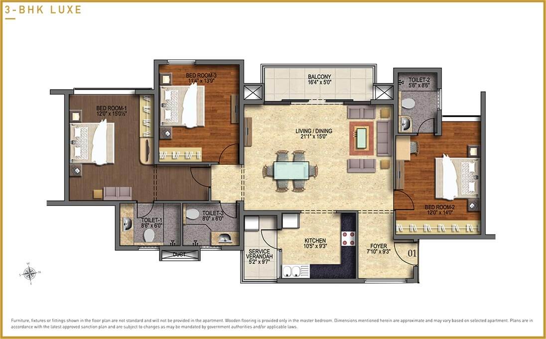 Living, dining, kitchen, and bedrooms will have vitrified tile flooring of 800mm x 800mm