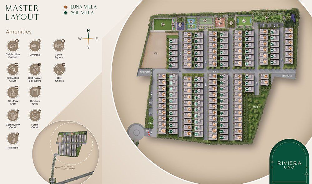 Some of the Amenities at Riviera Uno Villas include a fully equipped clubhouse, landscaped gardens, a gymnasium, swimming pool, recreation rooms, outdoor sports courts, children’s play area, and party hall. It is meticulously planned with utmost importance to state-of-the-art 24/7 security.