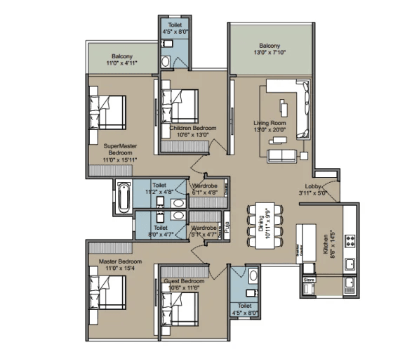| 4 BHK | 1641 - 1736 Sqft | 1641 - 1736 Sqft | ₹ 2.18 - 2.31 Cr |
