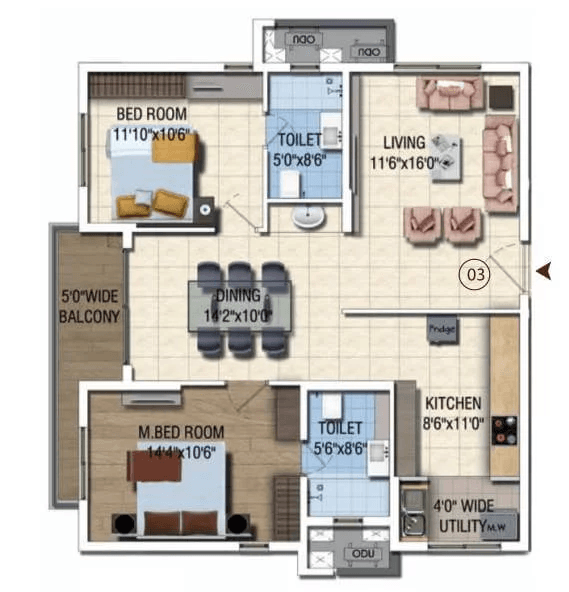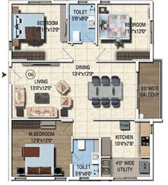Bedrooms, Kitchen, Balcony, Utility – Vitrified Tiles flooring.