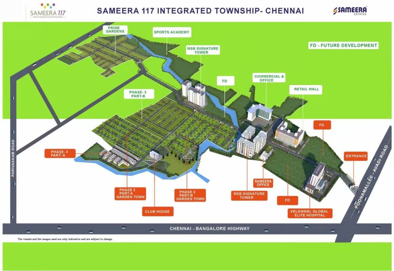 “SAMEERA 117 “ is the Next generation Township for Quality Living, Education, Healthcare, Hospitality and Entertainment! Located on the Poonamallee - Avadi High Road, Sameera 117 presents a range of affordable, mid segment & High end residential plots and well designed homes / villas for a blissful living. These residential communities are architecturally designed with 100% vaastu compliance spread across 117 acres of land extent. Sameera 117 stands tall as one of the Largest Township in the CMDA jurisdiction. ''