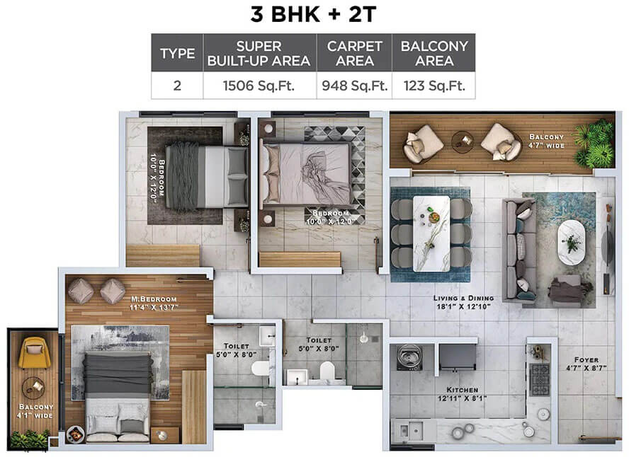 | 3 BHK | 1506 - 1809 Sqft | N/A | ₹ 1.32 - 1.58 Cr |