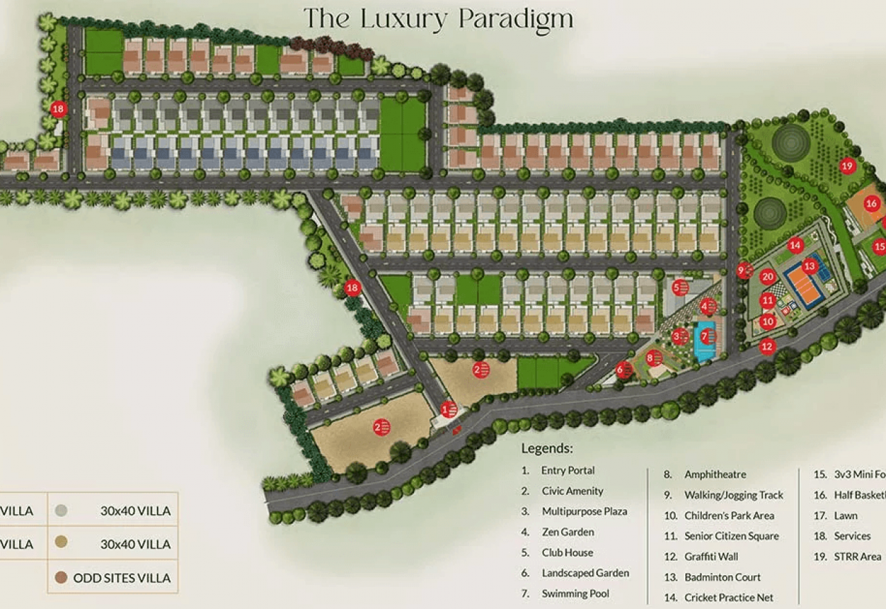 Some World-class Amenities at Sowparnika Life on the Green Villas include a fully equipped clubhouse, landscaped gardens, a gymnasium, a swimming pool, recreation rooms, outdoor sports courts, a children’s play area, a party hall, and meticulously planned utmost importance state-of-the-art 24/7 securities.