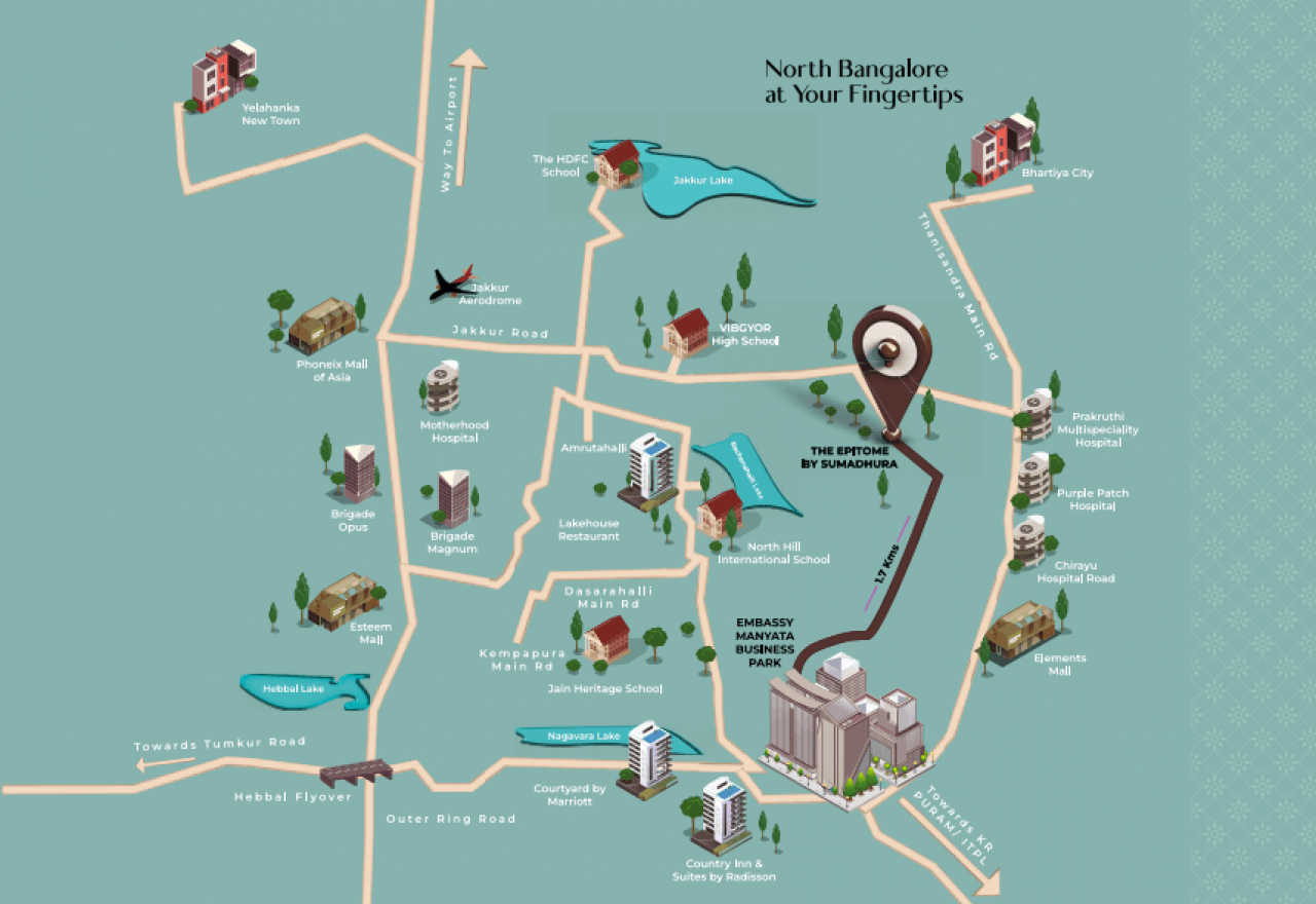 Sumadhura Epitome Location has excellent connectivity & it is located at the heart of Rachenahalli in North Bangalore at the crux of Jakkur, Thanisandra, Manyata Tech Park, off Hebbal, Bellary Road and Yelahanka while being near existing and upcoming communities & facilities.