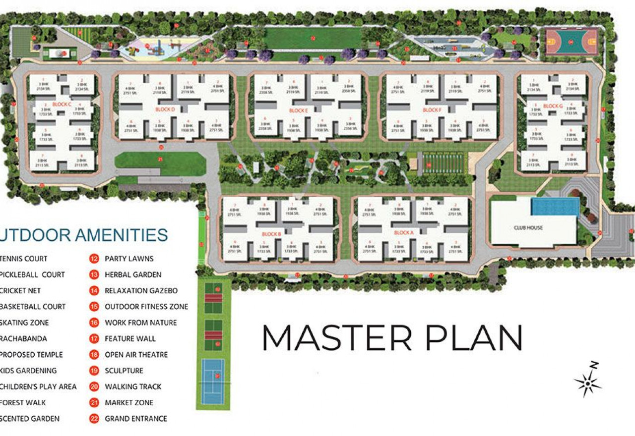 Amenities at Tridasa Rise include a fully equipped 55,000sft clubhouse, landscaped lavish gardens, a gymnasium, a swimming pool, recreation rooms, multiple sports courts, a children’s play area, a multipurpose party hall, outdoor workspaces, and meticulously planned with utmost importance to state-of-the-art 24/7 security.