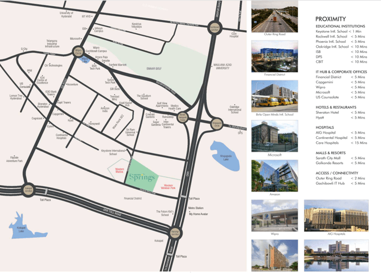 Western Springs Hyderabad Location has excellent connectivity & it is located at the crux of Financial District, Nanakramguda, Narsingi just off Nehru Outer Ring Road near existing and upcoming communities & facilities.
